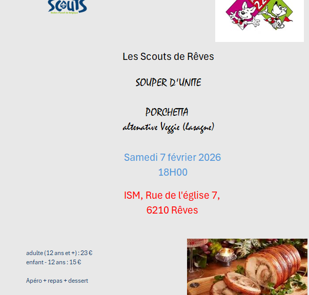 Le souper d’Unité des SCOUTS DE RÊVES aura lieu le samedi 7 Février2026 à partir de 17H45 dans le réfectoire de l’Institut Sainte-Marie.